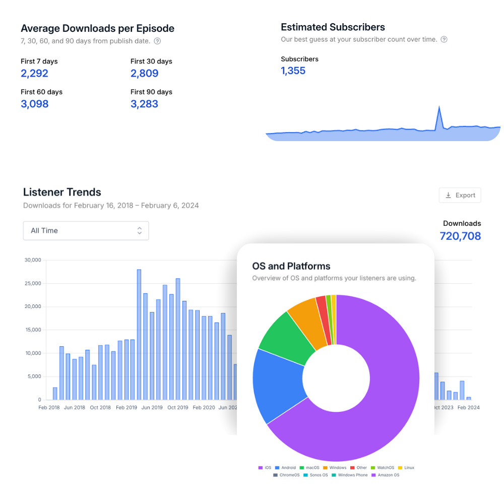 See your average downloads per episode, popular podcast apps, number of subscribers, trends.