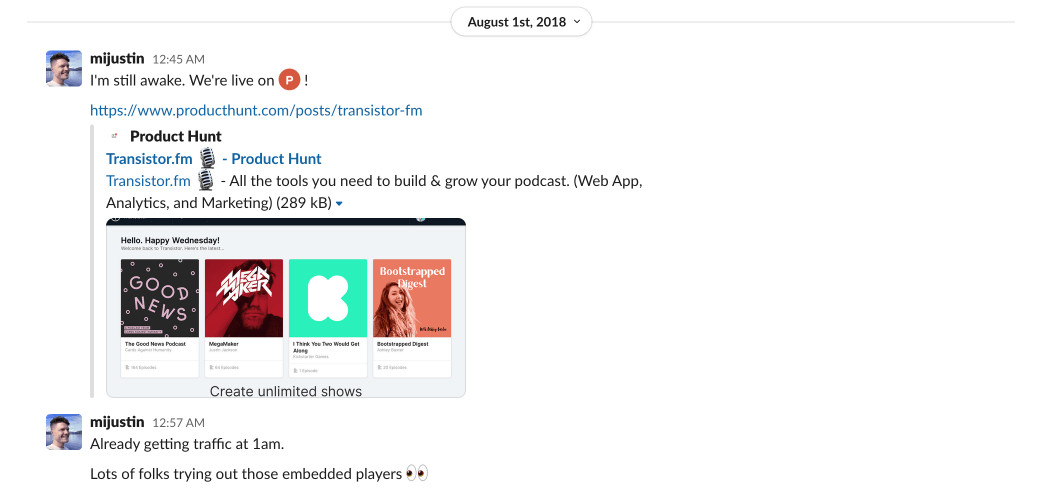 After getting home late, I stayed up until 12:01 am and posted it publicly on Product Hunt. Transistor was officially launched to the public!