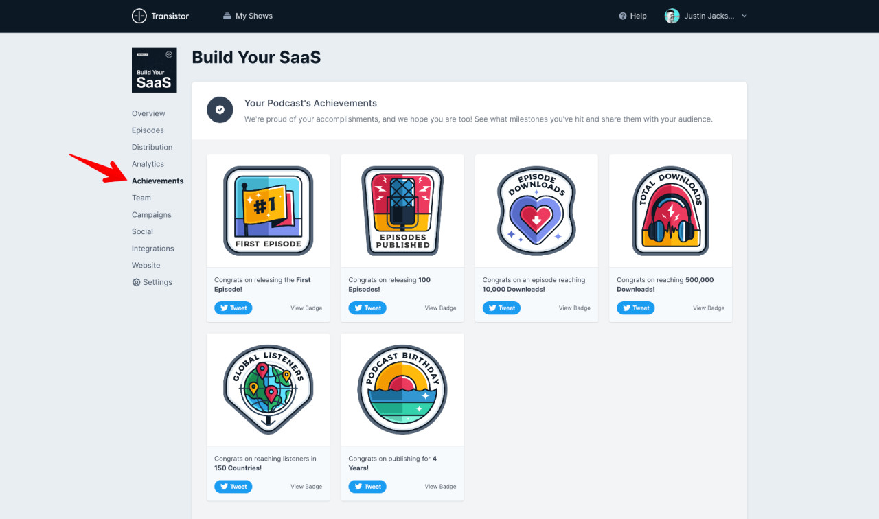 Now you can see your podcast's milestones and share them with your audience by going to the "Achievements" menu.