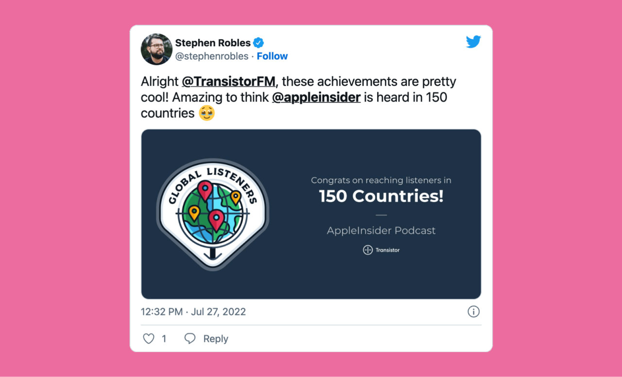 We generate badges for total episodes published, total podcast downloads, most popular episode, and how many countries your podcast is reaching.