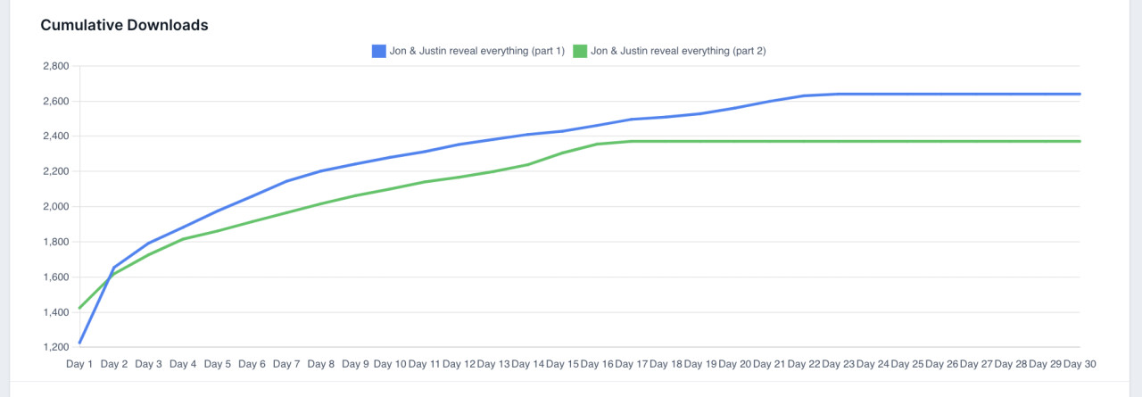 In addition to our Daily Downloads graph, we have now added a Cumulative Downloads graph. This allows you to better see the trajectory of an episode over a longer period of time, rather than comparing on a day-by-day basis.