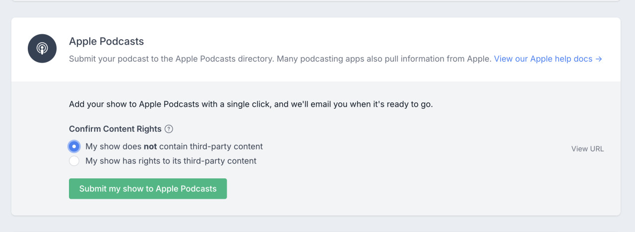 Submitting your show to the Apple Podcasts directory is now easier than ever. In Transistor's "Distribution" screen, all you have to do is click "the "Submit my show to Apple Podcasts" button.