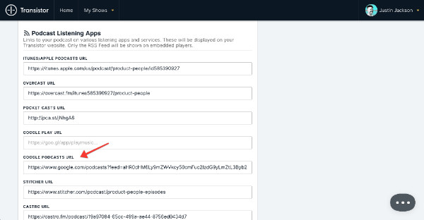 Go to the "Shows & Apps" menu in Transistor and paste in your unique Google Podcasts URL.