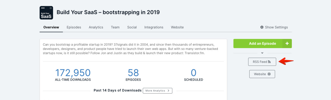 Find your podcast’s feed URL on the main dashboard in Transistor: