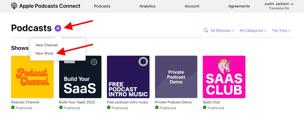 Add a new show in Apple Podcast Connect – once logged in to Podcasts Connect, click the purple "+" icon, and then select "New show."