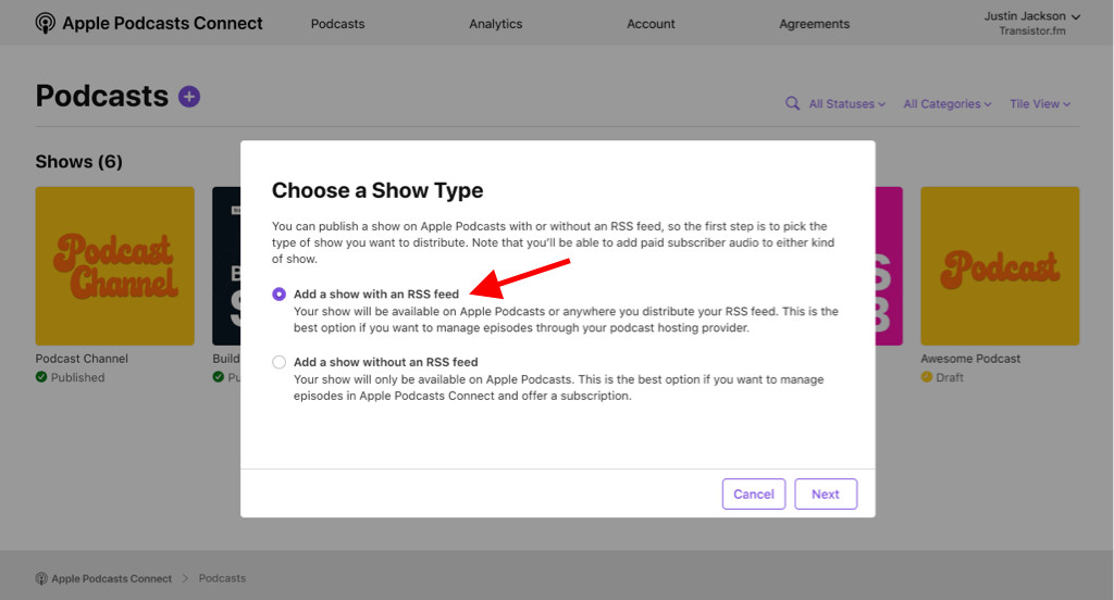 On the next screen in Podcast Connect, you'll choose "Add a show with an RSS feed."