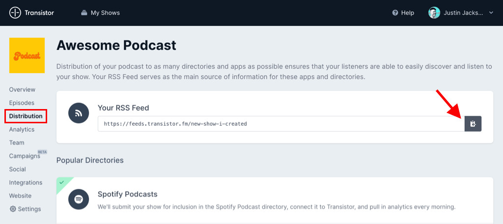 If you're using Transistor, you'll find it in the "Distribution" menu for your podcast:
