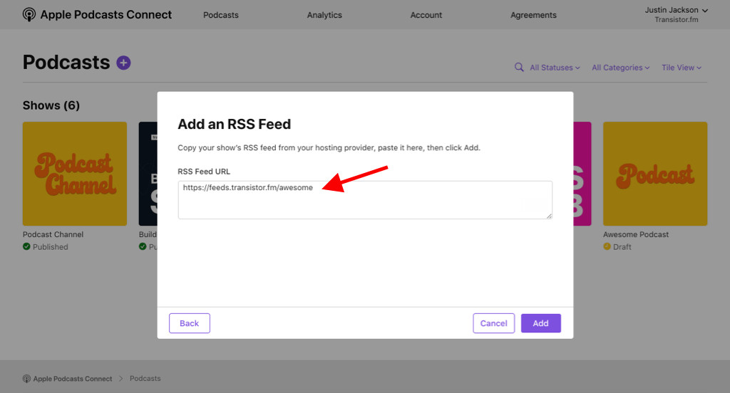 Now, go back to Apple's Podcast Connect, and paste in your RSS feed URL: