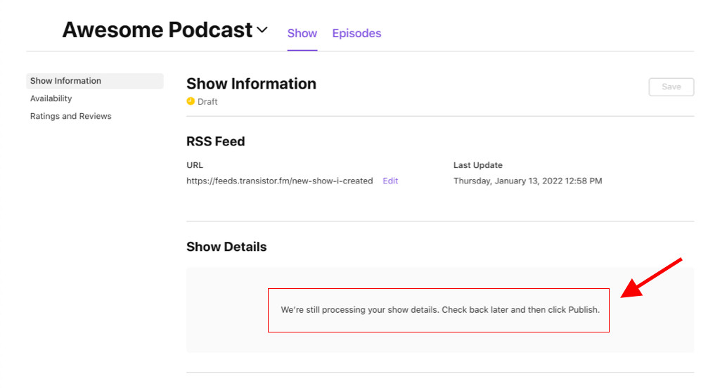 At this point, Apple will need to process your RSS feed before you can actually submit it. This usually takes 5-10 minutes.